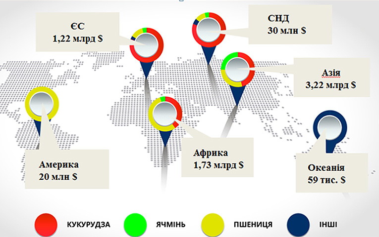 Лідером з експорту зернових стали країни Азії, які закупили зерна на $3,22 млрд. Менше всього експортувала Океанія - на $59 тис.