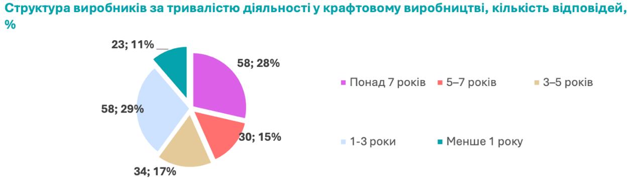 Найбільша частка респондентів займається крафтовим виробництвом понад 7 років. Більше половини учасників опитування ведуть діяльність у цій сфері понад 3 роки, тоді як найменша частка респондентів — 11% — працює у галузі менше року.