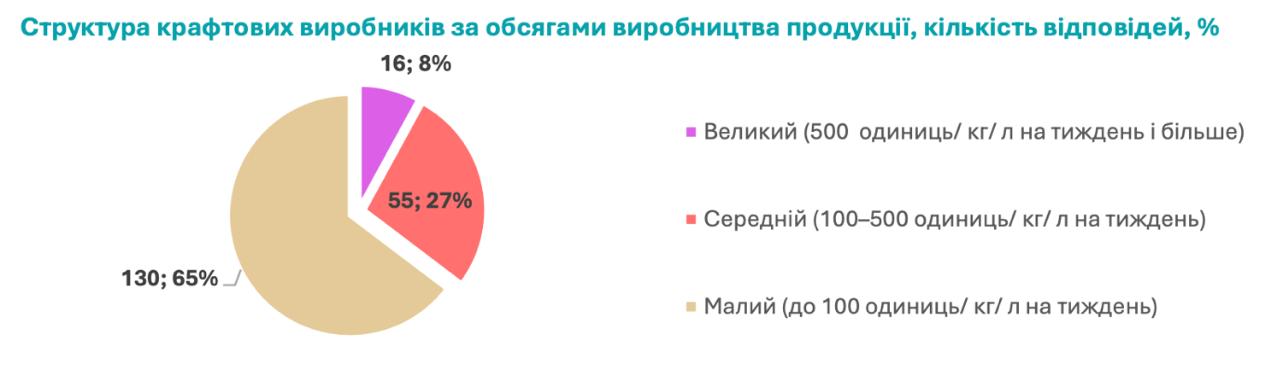 У 92% респондентів тижневий обсяг виробництва не перевищує 500 кілограмів, літрів або одиниць продукції, тоді як у 65% — не досягає і 100 одиниць відповідної міри. Формально «мале виробництво» в Україні — це до 1000 кг/л на тиждень. Тобто реальний крафтовий сектор значно менший за той поріг, який держава визначає як «малий».