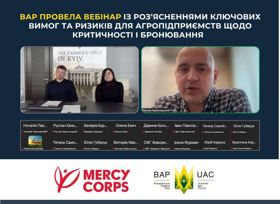 Всеукраїнська аграрна рада (ВАР) провела вебінар для аграріїв, присвячений процедурі отримання статусу критично важливого підприємства та бронювання працівників в умовах воєнного стану.